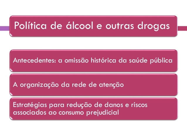 32. 32. Política de álcool e outras drogas Antecedentes: a omissão histórica da saúde pública A organização da rede de atenção Estratégias para redução de danos e riscos associados ao consumo prejudicial