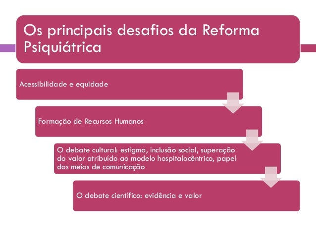 33. 33. Os principais desafios da Reforma Psiquiátrica Acessibilidade e equidade Formação de Recursos Humanos O debate cultural: estigma, inclusão social, superação do valor atribuído ao modelo hospitalocêntrico, papel dos meios de comunicação O debate científico: evidência e valor