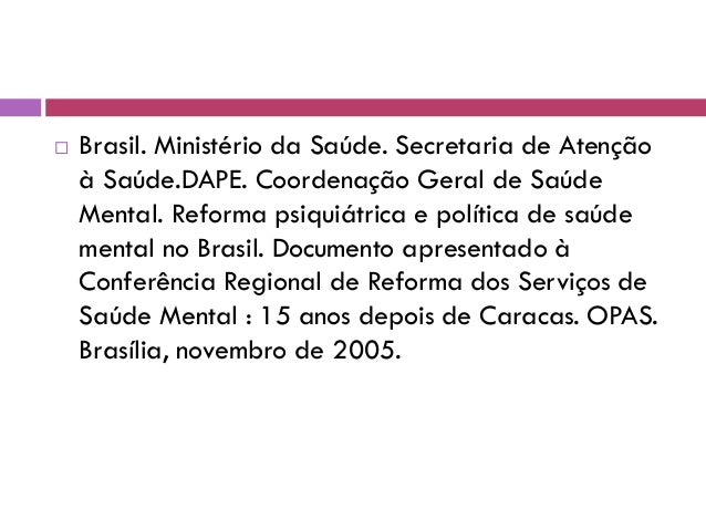 36. 36.  Brasil. Ministério da Saúde. Secretaria de Atenção à Saúde.DAPE. Coordenação Geral de Saúde Mental. Reforma psiquiátrica e política de saúde mental no Brasil. Documento apresentado à Conferência Regional de Reforma dos Serviços de Saúde Mental : 15 anos depois de Caracas. OPAS. Brasília, novembro de 2005.