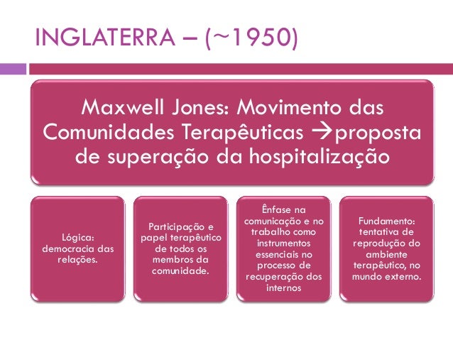 4. 4. INGLATERRA – (~1950) Maxwell Jones: Movimento das Comunidades Terapêuticas proposta de superação da hospitalização Lógica: democracia das relações. Participação e papel terapêutico de todos os membros da comunidade. Ênfase na comunicação e no trabalho como instrumentos essenciais no processo de recuperação dos internos Fundamento: tentativa de reprodução do ambiente terapêutico, no mundo externo.