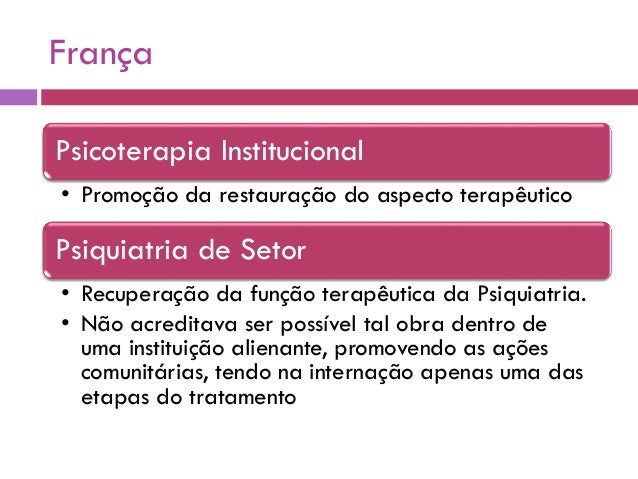 5. 5. França Psicoterapia Institucional • Promoção da restauração do aspecto terapêutico Psiquiatria de Setor • Recuperação da função terapêutica da Psiquiatria. • Não acreditava ser possível tal obra dentro de uma instituição alienante, promovendo as ações comunitárias, tendo na internação apenas uma das etapas do tratamento