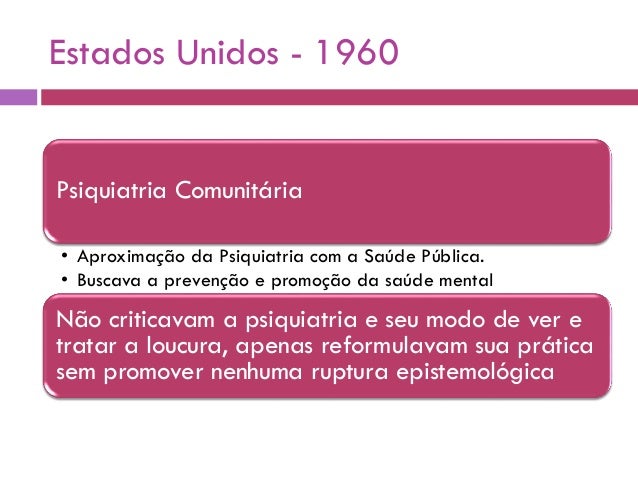 6. 6. Estados Unidos - 1960 Psiquiatria Comunitária • Aproximação da Psiquiatria com a Saúde Pública. • Buscava a prevenção e promoção da saúde mental Não criticavam a psiquiatria e seu modo de ver e tratar a loucura, apenas reformulavam sua prática sem promover nenhuma ruptura epistemológica