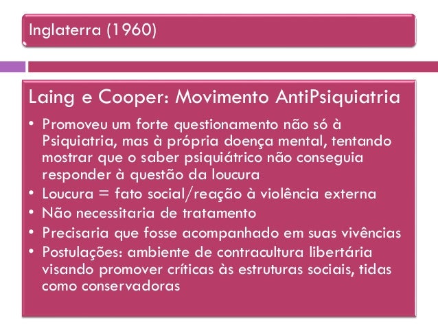 7. 7. Inglaterra (1960) Laing e Cooper: Movimento AntiPsiquiatria • Promoveu um forte questionamento não só à Psiquiatria, mas à própria doença mental, tentando mostrar que o saber psiquiátrico não conseguia responder à questão da loucura • Loucura = fato social/reação à violência externa • Não necessitaria de tratamento • Precisaria que fosse acompanhado em suas vivências • Postulações: ambiente de contracultura libertária visando promover críticas às estruturas sociais, tidas como conservadoras