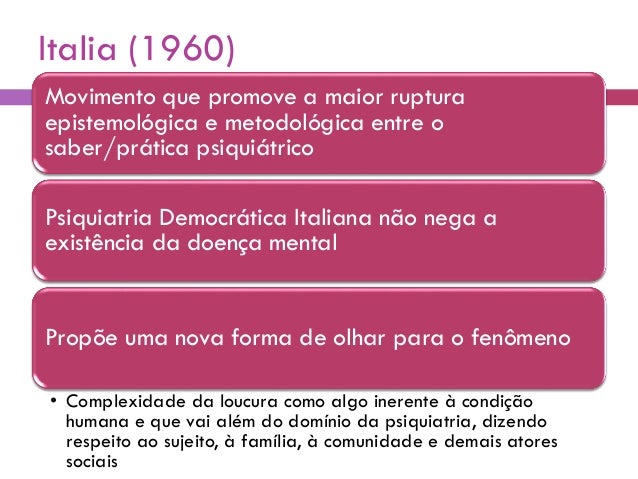 8. 8. Italia (1960) Movimento que promove a maior ruptura epistemológica e metodológica entre o saber/prática psiquiátrico Psiquiatria Democrática Italiana não nega a existência da doença mental Propõe uma nova forma de olhar para o fenômeno • Complexidade da loucura como algo inerente à condição humana e que vai além do domínio da psiquiatria, dizendo respeito ao sujeito, à família, à comunidade e demais atores sociais