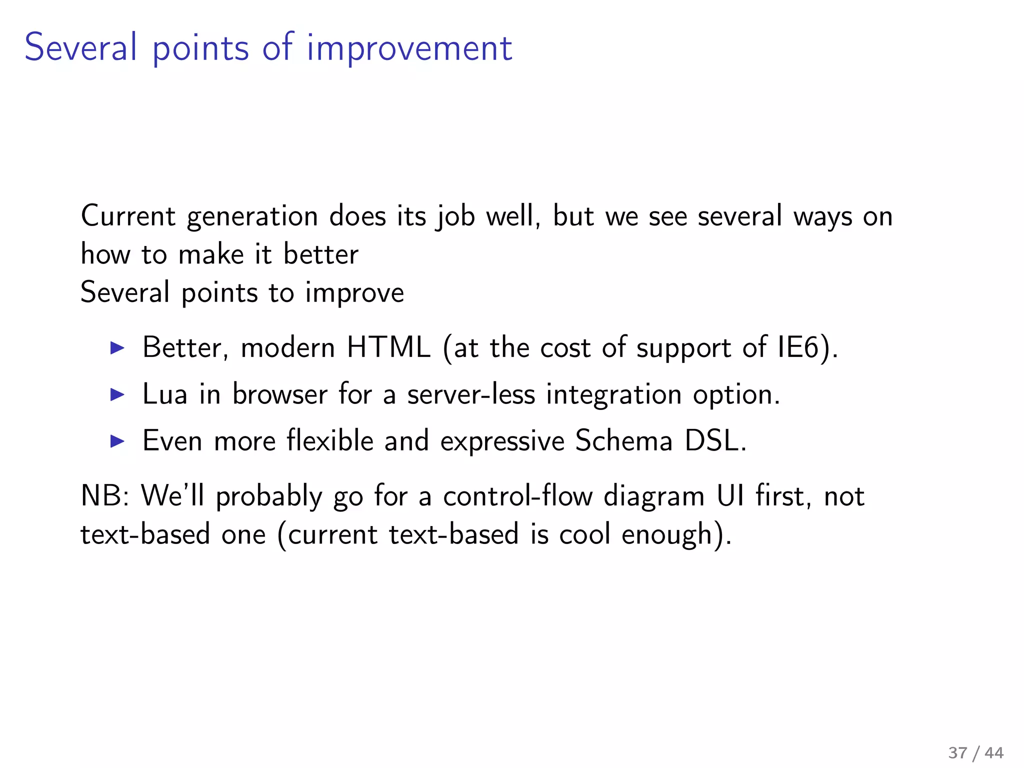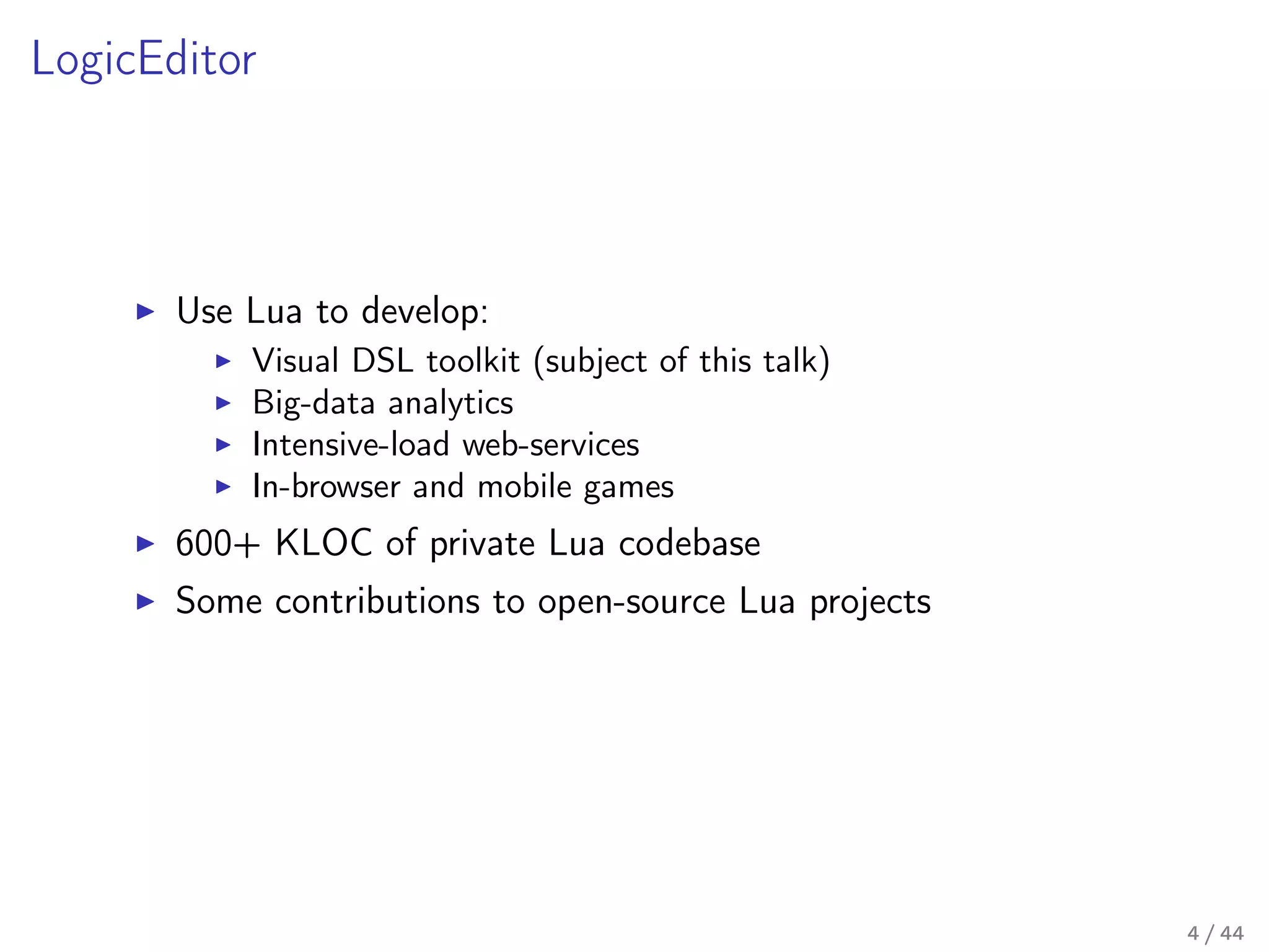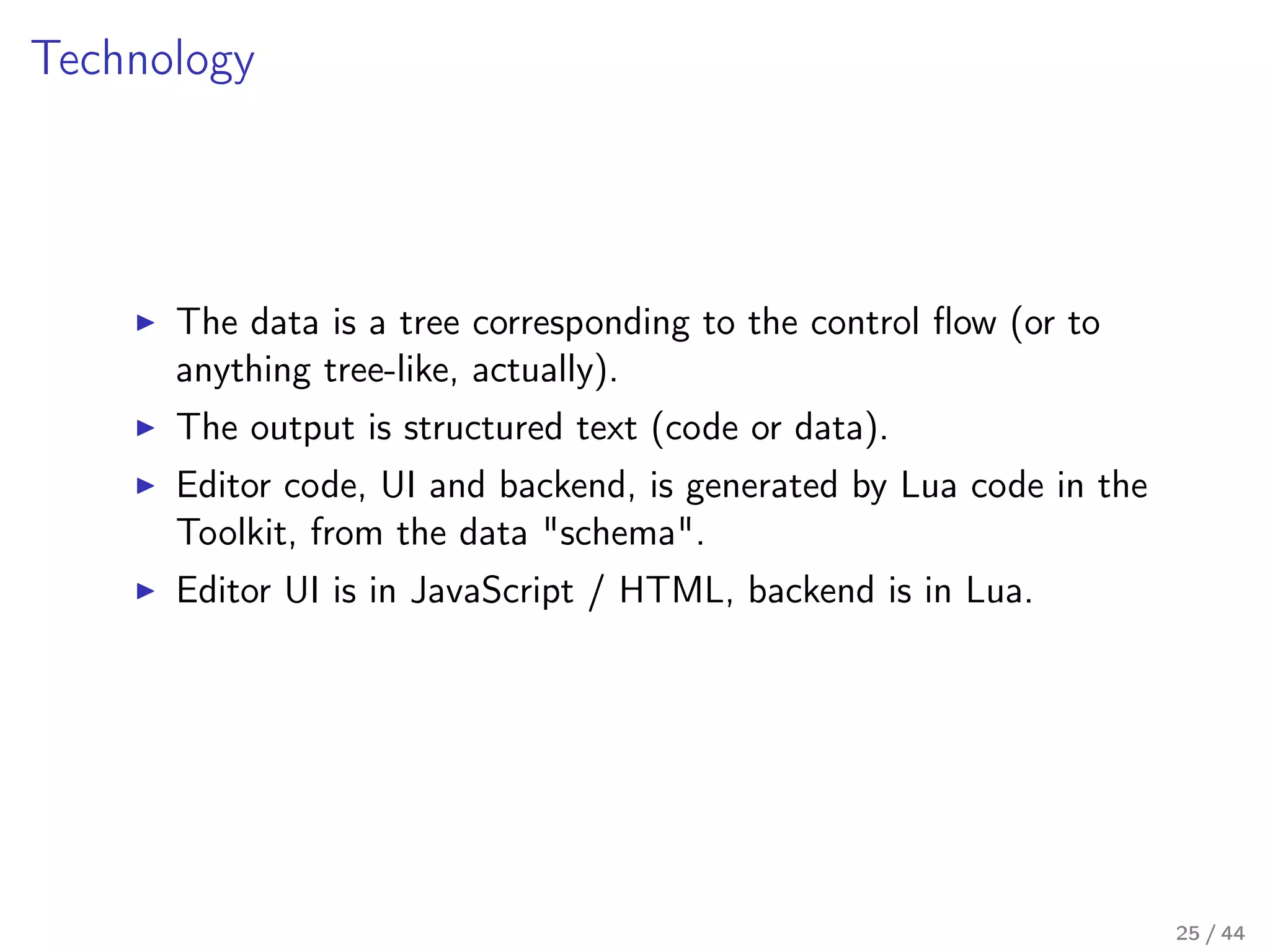 Our toolkit is written in Lua (and some JavaScript), and it is a seventh generation implementation of the concept behind it. In this talk I'll talk a little about the past generations, describe the mechanics behind the current implementation in some detail, and I'll share our thoughts on how the next generation should look like – a new approach on the internal DSL design in Lua.