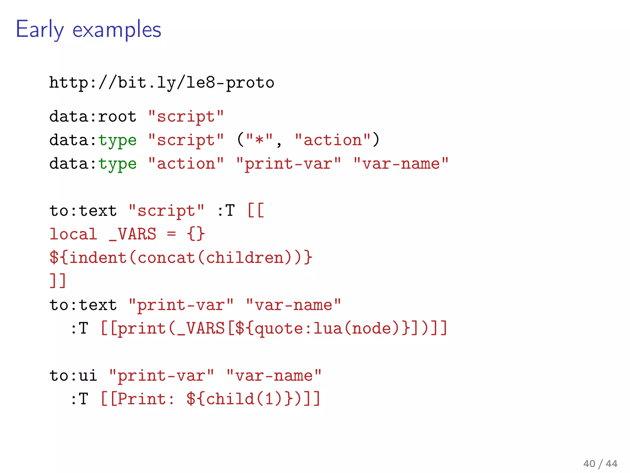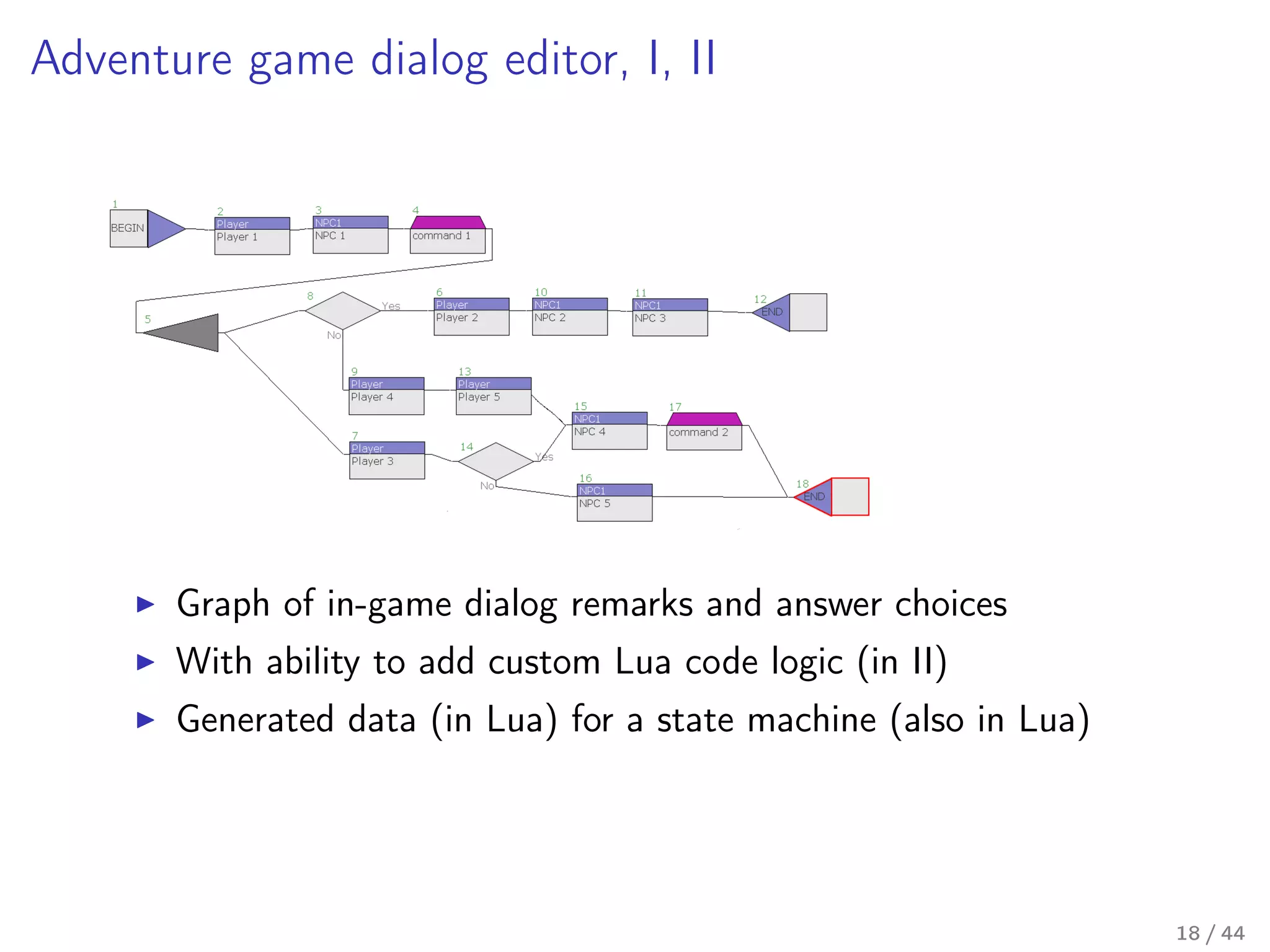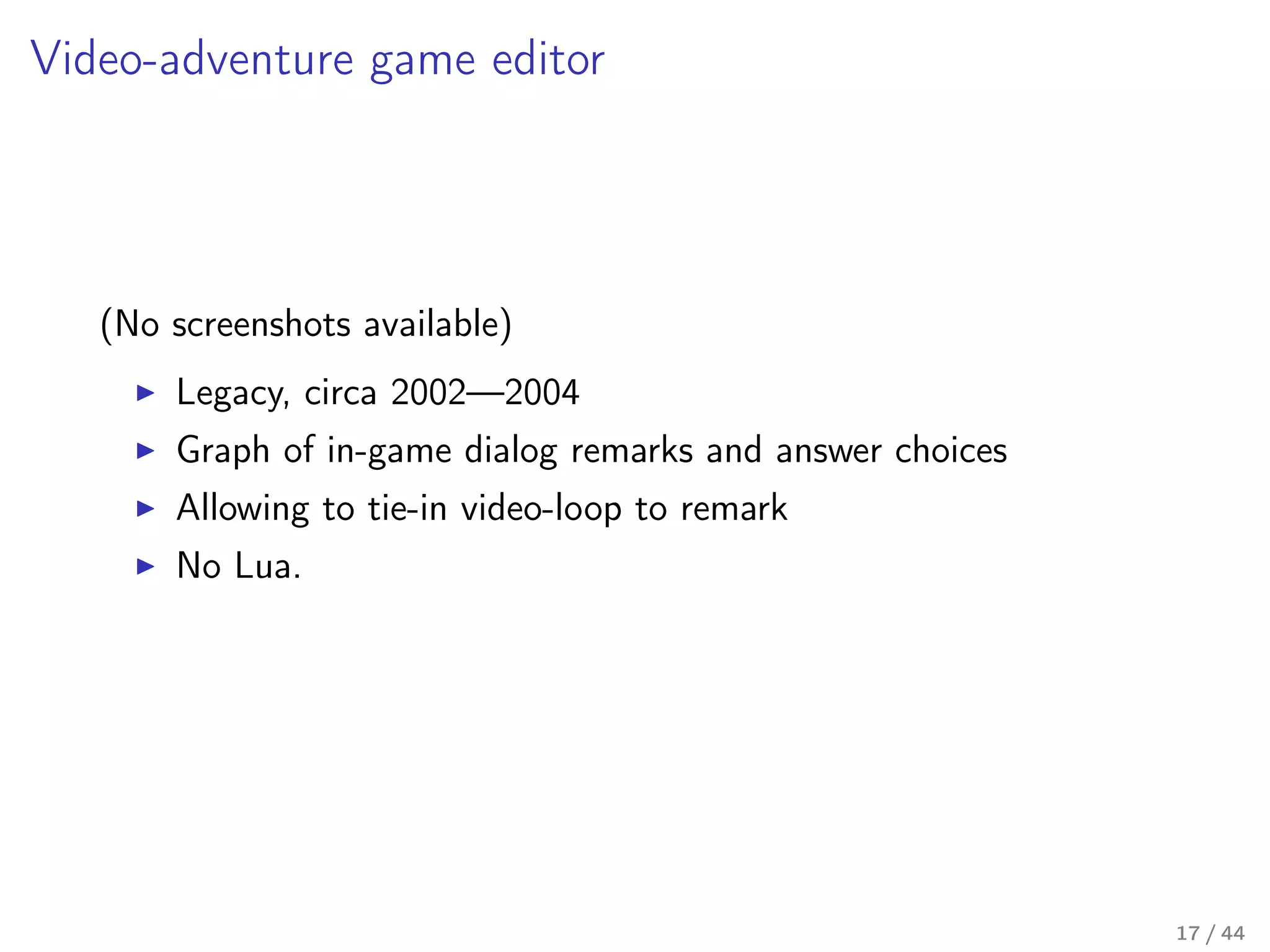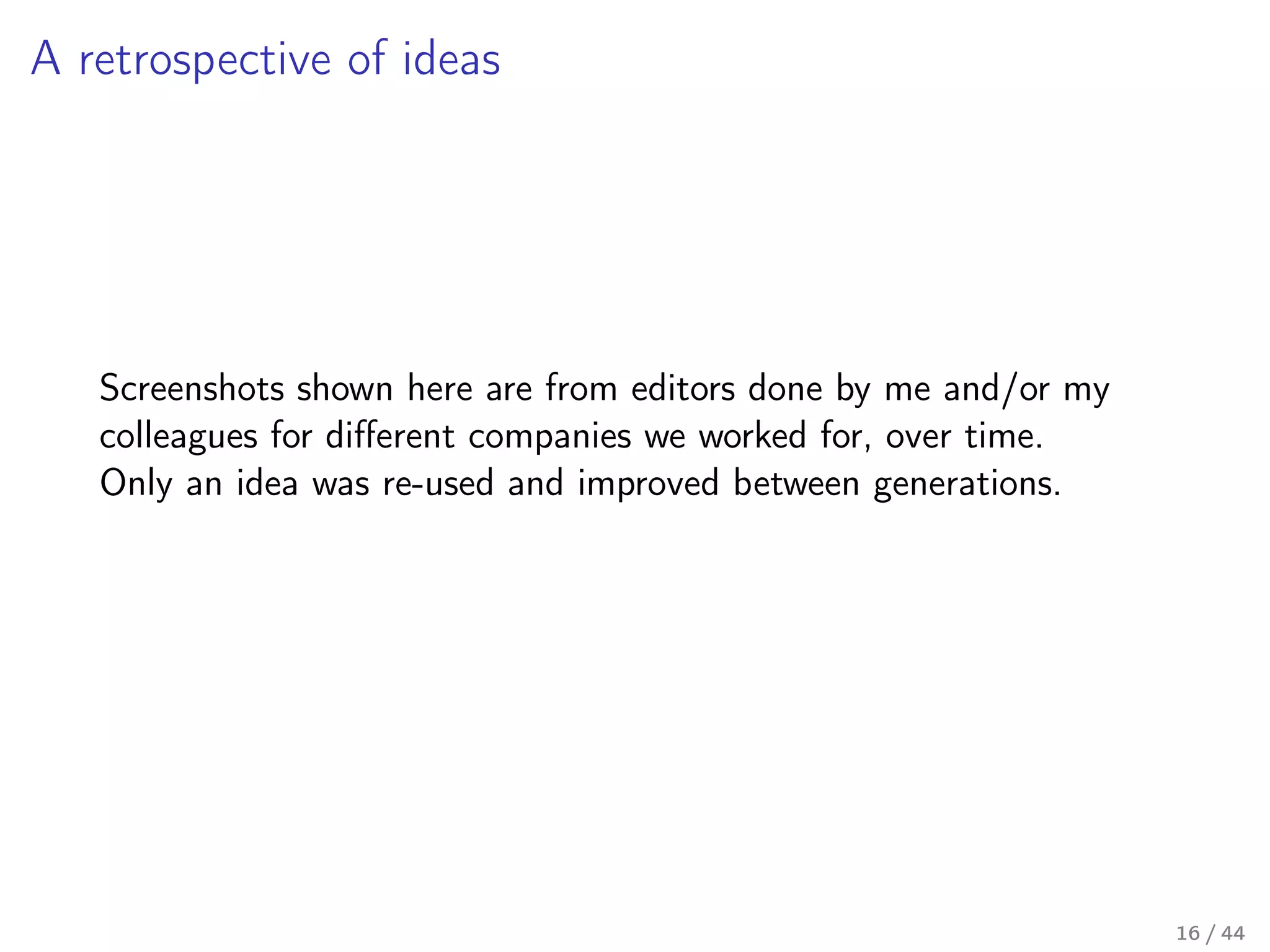 Our toolkit is written in Lua (and some JavaScript), and it is a seventh generation implementation of the concept behind it. In this talk I'll talk a little about the past generations, describe the mechanics behind the current implementation in some detail, and I'll share our thoughts on how the next generation should look like – a new approach on the internal DSL design in Lua.