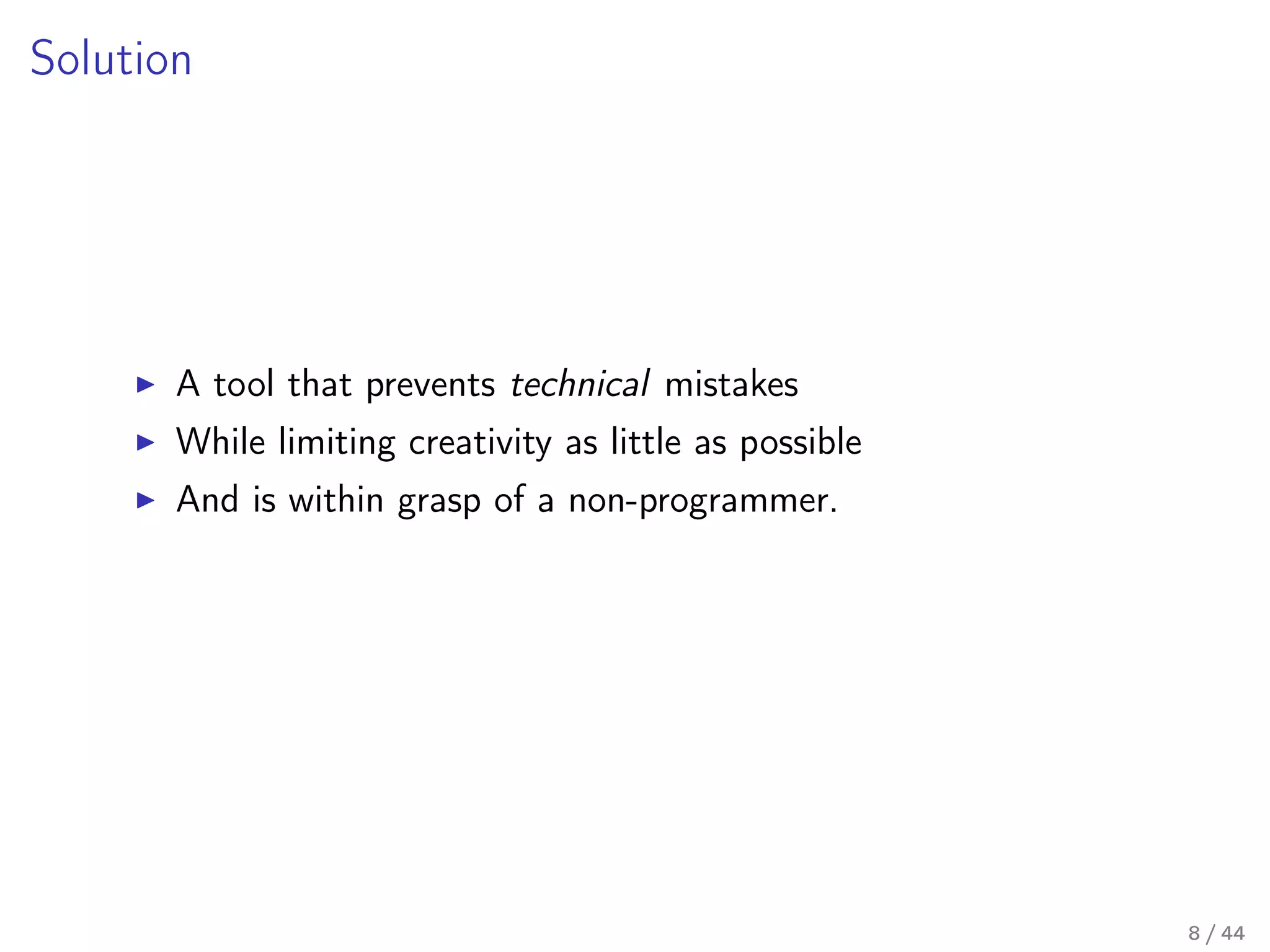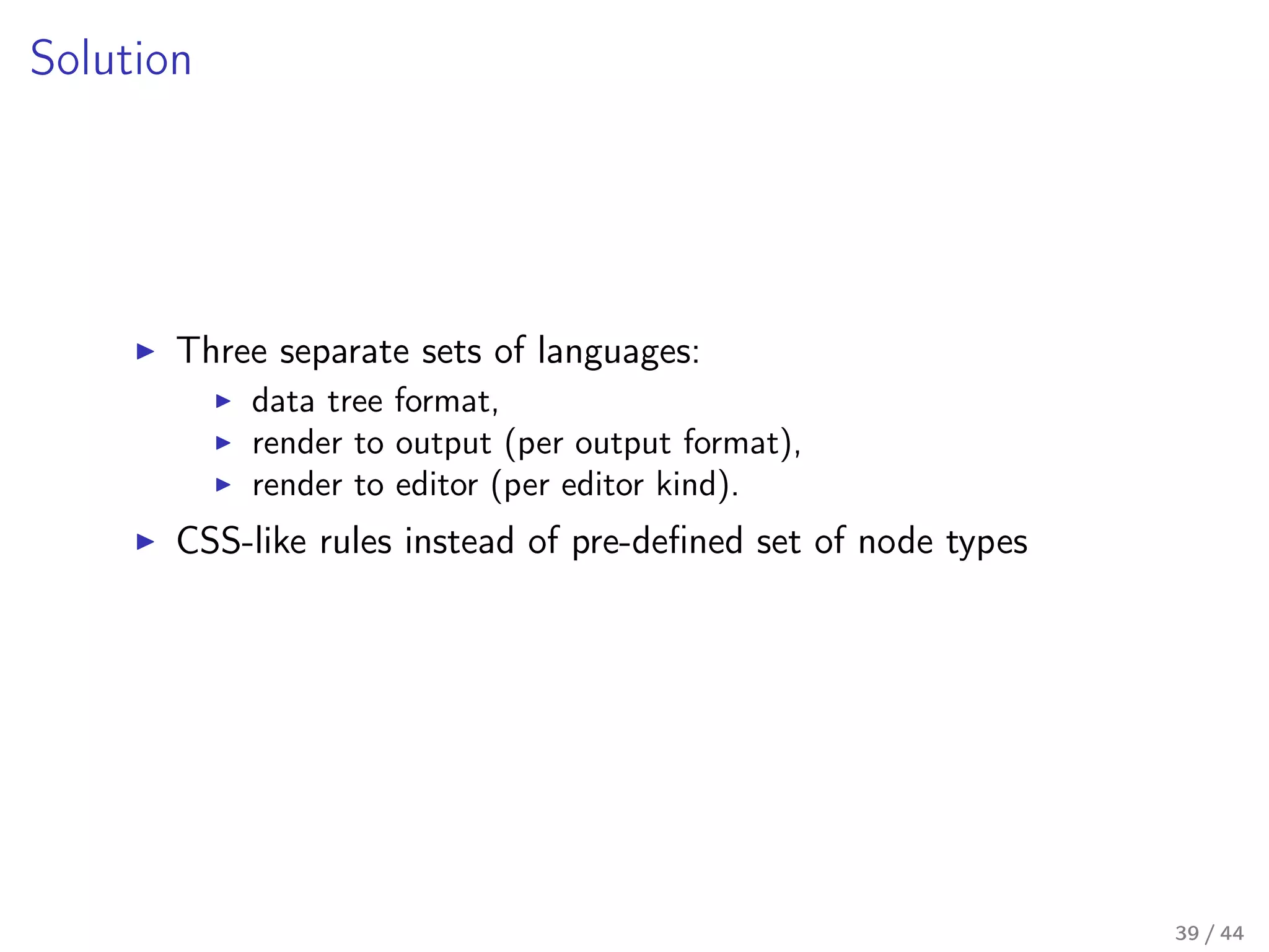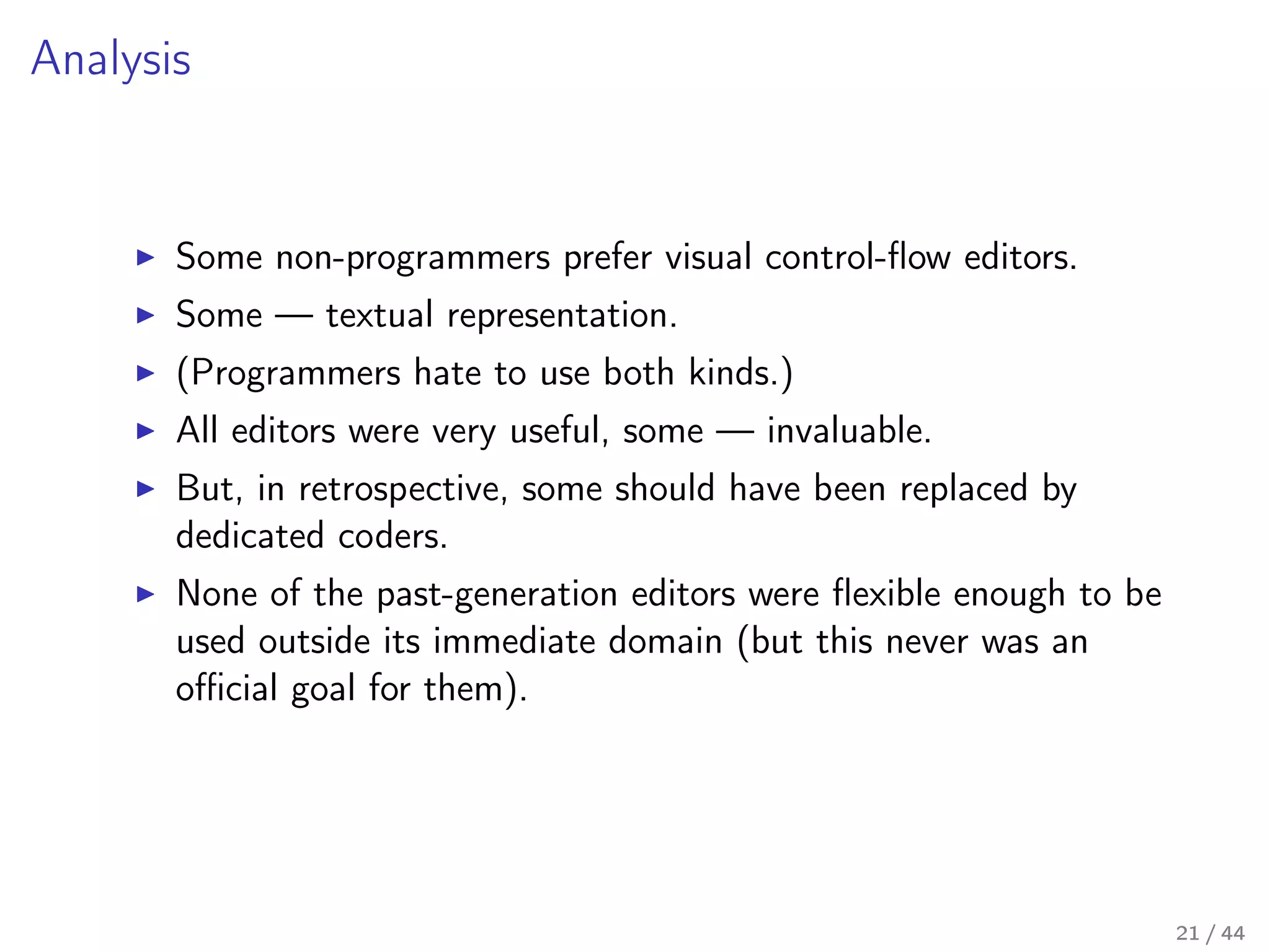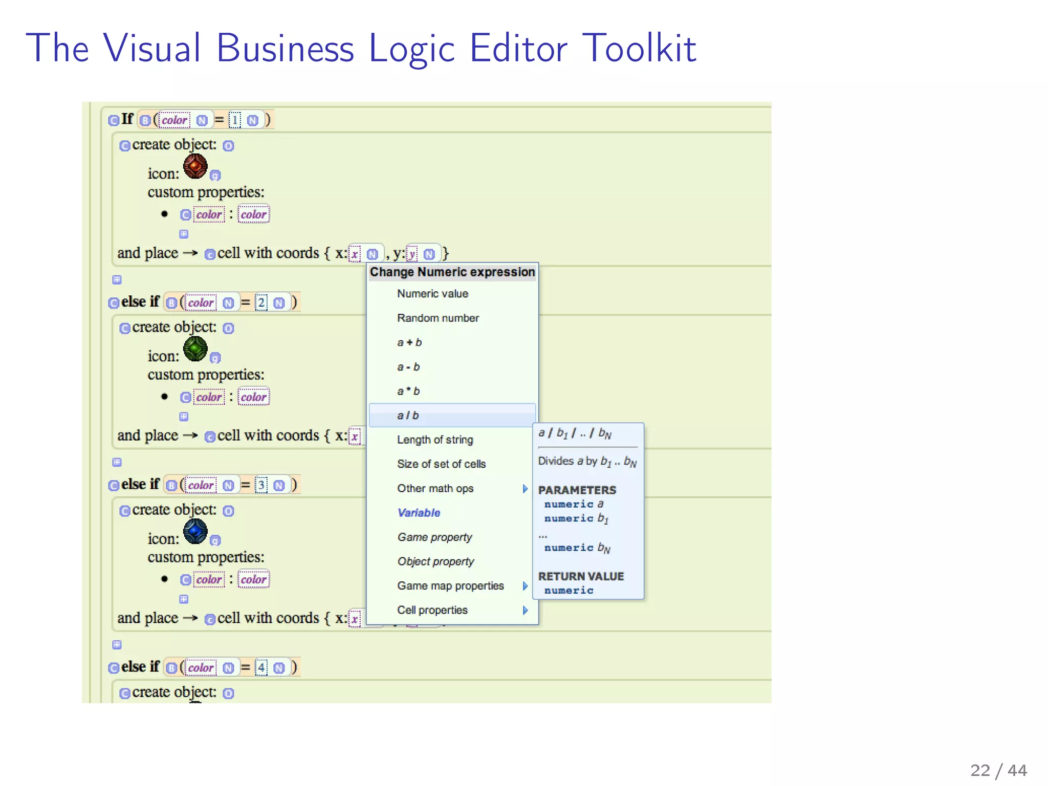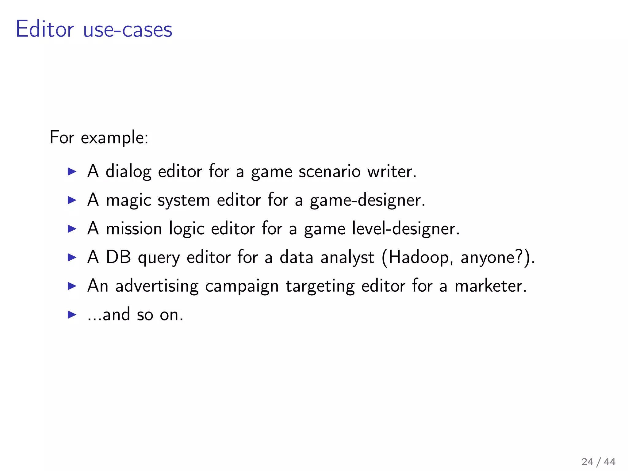 Our flagship product – Business logic editor toolkit – attempts to alleviate that somewhat by providing a programmer with a set of tools to easily build a business-logic configuration UI, suitable for a non-programmer domain expert, and an easy, platform-agnostic way to seamlessly tie business-logic configuration from that UI to an existing (or newly written) codebase, effectively creating a visual domain-specific programming language.