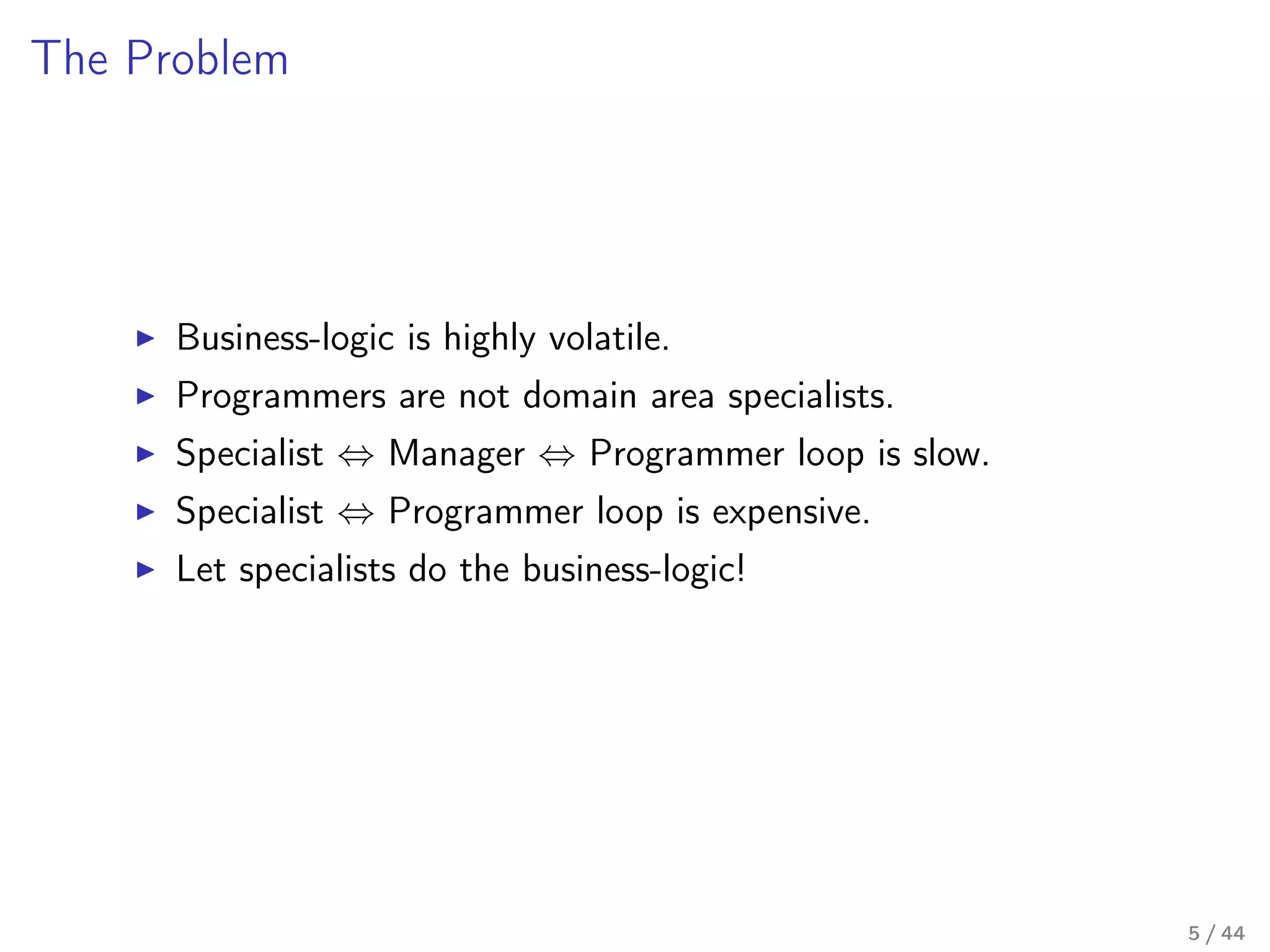 Nevertheless, Lua is a programming language, and in order to learn it one must invest a considerable effort to learn to write programs. It is often the case that, on one hand, there is a need to configure lots and lots of business logic intricate and ever-changing rules, but, on the other hand, the person who has the most expertise on the particular business logic area – domain expert – not have any clue on how to write code effectively (or even at all).