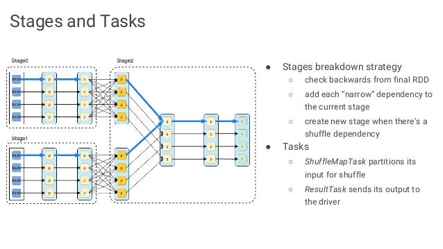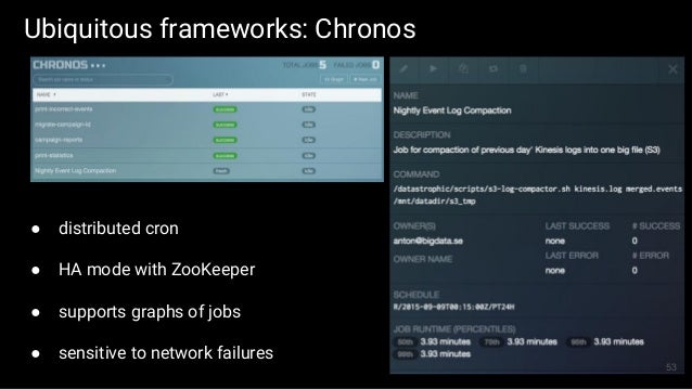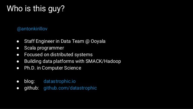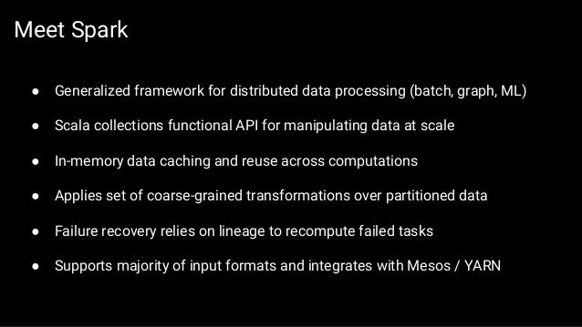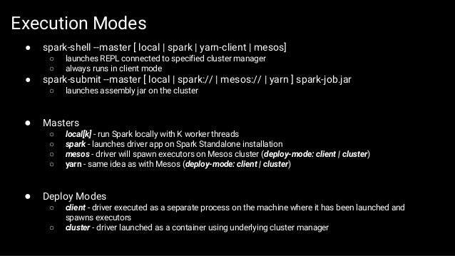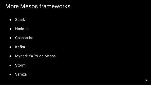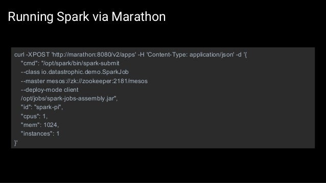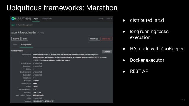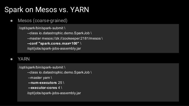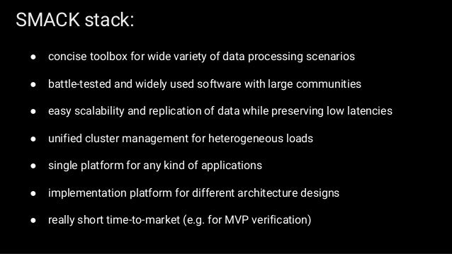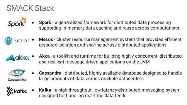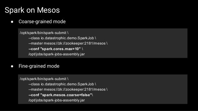 The first part of the slides contains general overview of SMACK stack and possible architecture layouts that could be implemented on top of it. We discuss Apache Spark internals: the concept of RDD, DAG logical view and dependencies types, execution workflow, shuffle process and core Spark components. The second part is dedicated to Mesos architecture and the concept of framework, different ways of running applications and schedule Spark jobs on top of it. We'll take a look at popular frameworks like Marathon and Chronos and see how Spark Jobs and Docker containers are executed using them.