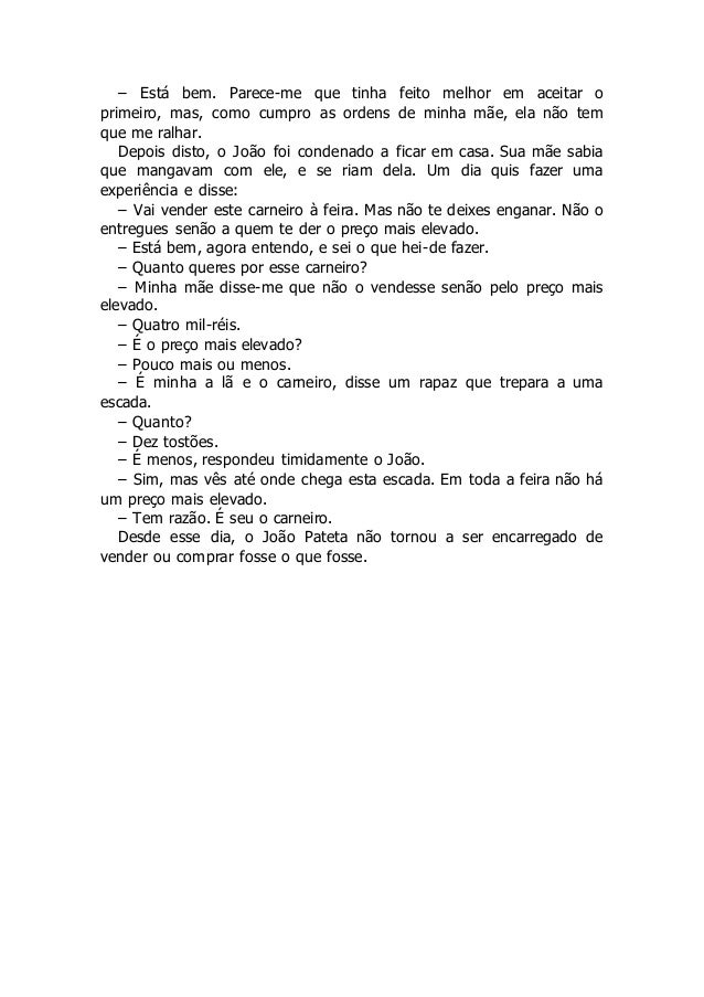 2. 2. – Está bem. Parece-me que tinha feito melhor em aceitar o primeiro, mas, como cumpro as ordens de minha mãe, ela não tem que me ralhar. Depois disto, o João foi condenado a ficar em casa. Sua mãe sabia que mangavam com ele, e se riam dela. Um dia quis fazer uma experiência e disse: – Vai vender este carneiro à feira. Mas não te deixes enganar. Não o entregues senão a quem te der o preço mais elevado. – Está bem, agora entendo, e sei o que hei-de fazer. – Quanto queres por esse carneiro? – Minha mãe disse-me que não o vendesse senão pelo preço mais elevado. – Quatro mil-réis. – É o preço mais elevado? – Pouco mais ou menos. – É minha a lã e o carneiro, disse um rapaz que trepara a uma escada. – Quanto? – Dez tostões. – É menos, respondeu timidamente o João. – Sim, mas vês até onde chega esta escada. Em toda a feira não há um preço mais elevado. – Tem razão. É seu o carneiro. Desde esse dia, o João Pateta não tornou a ser encarregado de vender ou comprar fosse o que fosse.