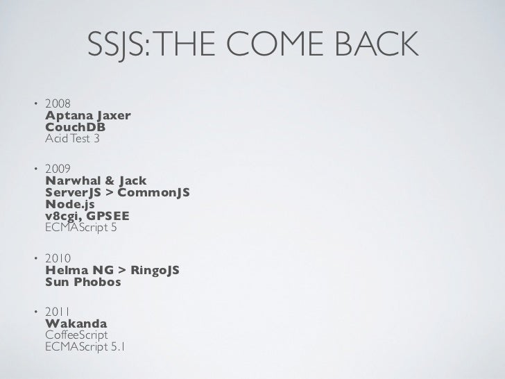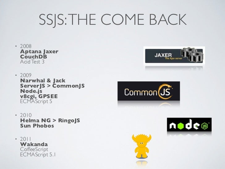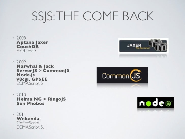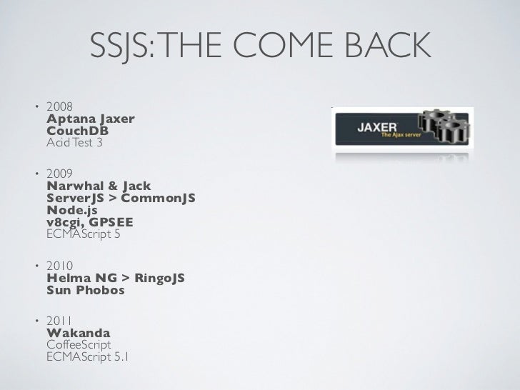 10. 10. SSJS: THE COME BACK• 2008 Aptana Jaxer CouchDB Acid Test 3• 2009 Narwhal & Jack ServerJS > CommonJS Node.js v8cgi, GPSEE ECMAScript 5• 2010 Helma NG > RingoJS Sun Phobos• 2011 Wakanda CoffeeScript ECMAScript 5.1