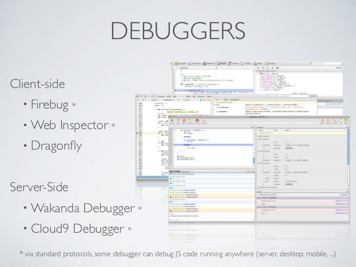 17. 17. DEBUGGERSClient-side • Firebug * • Web Inspector * • DragonflyServer-Side • Wakanda Debugger * • Cloud9 Debugger * * via standard protocols, some debugger can debug JS code running anywhere (server, desktop, mobile, ...)