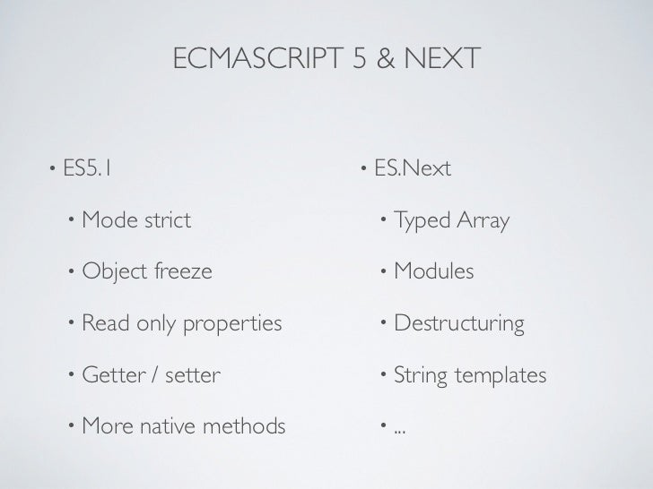 18. 18. ECMASCRIPT 5 & NEXT• ES5.1 • ES.Next • Mode strict • Typed Array • Object freeze • Modules • Read only properties • Destructuring • Getter / setter • String templates • More native methods • ...