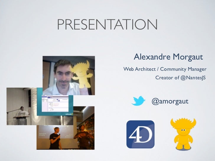 2. 2. PRESENTATION Alexandre Morgaut Web Architect / Community Manager Creator of @NantesJS @amorgaut