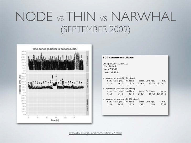28. 28. NODE VS THIN VS NARWHAL (SEPTEMBER 2009) 300 concurrent clients completed requests: thin 36045 node 35668 narwhal 2921 > summary(node300$ttime) Min. 1st Qu. Median Mean 3rd Qu. Max. 12.0 66.0 112.0 239.4 157.0 12200.0 > summary(thin300$ttime) Min. 1st Qu. Median Mean 3rd Qu. Max. 71.0 84.0 87.0 208.7 107.0 23950.0 > summary(narwhal300$ttime) Min. 1st Qu. Median Mean 3rd Qu. Max. 928 2837 2935 2921 3018 8759 http://four.livejournal.com/1019177.html