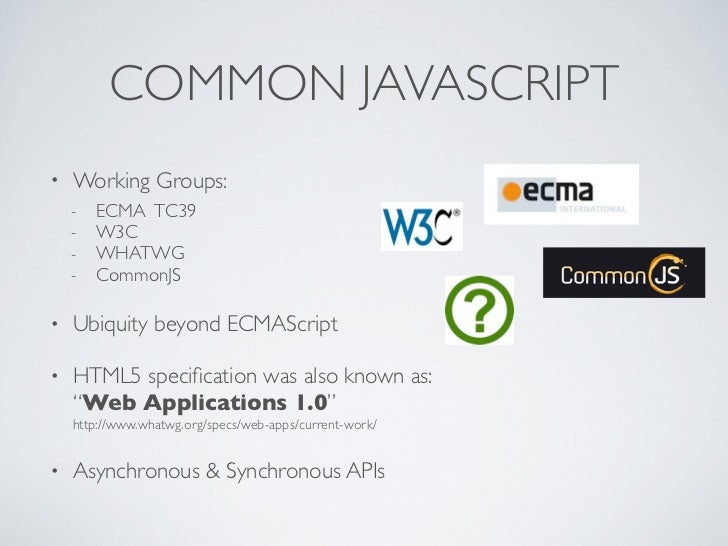 35. 35. COMMON JAVASCRIPT• Working Groups: - ECMA TC39 - W3C - WHATWG - CommonJS• Ubiquity beyond ECMAScript• HTML5 specification was also known as: “Web Applications 1.0” http://www.whatwg.org/specs/web-apps/current-work/• Asynchronous & Synchronous APIs