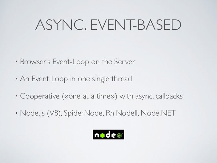 36. 36. ASYNC. EVENT-BASED• Browser’s Event-Loop on the Server• An Event Loop in one single thread• Cooperative («one at a time») with async. callbacks• Node.js (V8), SpiderNode, RhiNodeII, Node.NET