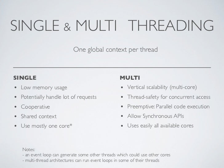 37. 37. SINGLE & MULTI THREADING One global context per threadSINGLE MULTI• Low memory usage • Vertical scalability (multi-core)• Potentially handle lot of requests • Thread-safety for concurrent access• Cooperative • Preemptive: Parallel code execution• Shared context • Allow Synchronous APIs• Use mostly one core* • Uses easily all available cores Notes: - an event loop can generate some other threads which could use other cores - multi-thread architectures can run event loops in some of their threads