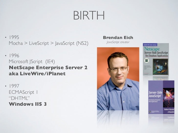 4. 4. BIRTH• 1995 Brendan Eich Mocha > LiveScript > JavaScript (NS2) JavaScript creator• 1996 Microsoft JScript (IE4) NetScape Enterprise Server 2 aka LiveWire/iPlanet• 1997 ECMAScript 1 “DHTML” Windows IIS 3