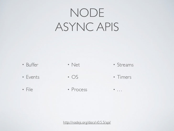 41. 41. NODE ASYNC APIS• Buffer • Net • Streams• Events • OS • Timers• File • Process • ... http://nodejs.org/docs/v0.5.5/api/