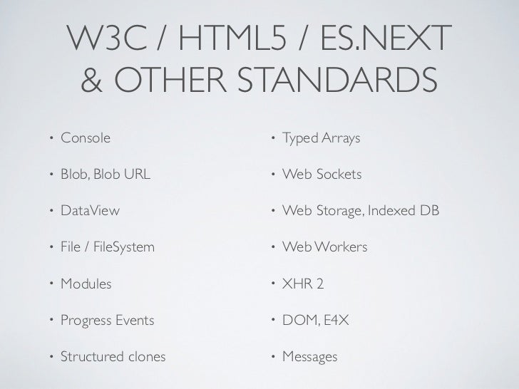 42. 42. W3C / HTML5 / ES.NEXT & OTHER STANDARDS• Console • Typed Arrays• Blob, Blob URL • Web Sockets• DataView • Web Storage, Indexed DB• File / FileSystem • Web Workers• Modules • XHR 2• Progress Events • DOM, E4X• Structured clones • Messages