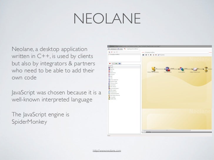 46. 46. NEOLANENeolane, a desktop applicationwritten in C++, is used by clientsbut also by integrators & partnerswho need to be able to add theirown codeJavaScript was chosen because it is awell-known interpreted languageThe JavaScript engine isSpiderMonkey http://www.neolane.com
