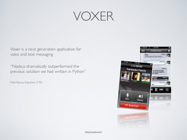 48. 48. VOXERVoxer is a next generation application forvoice and text messaging“Node.js dramatically outperformed theprevious solution we had written in Python”Matt Rainey, RebelVox CTO http://voxer.com/