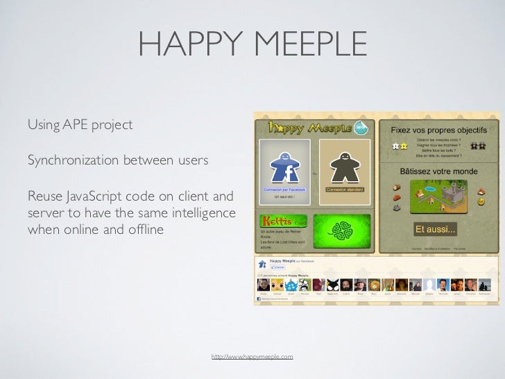 49. 49. HAPPY MEEPLEUsing APE projectSynchronization between usersReuse JavaScript code on client andserver to have the same intelligencewhen online and offline http://www.happymeeple.com
