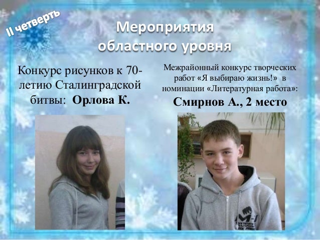 9. 9. Мероприятия областного уровня Конкурс рисунков к 70- летию Сталинградской битвы: Орлова К. Межрайонный конкурс творческих работ «Я выбираю жизнь!» в номинации «Литературная работа»: Смирнов А., 2 место