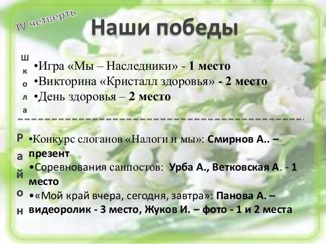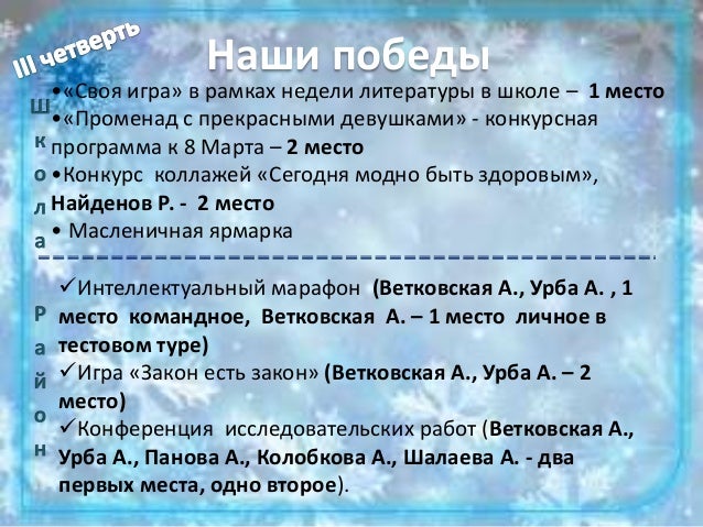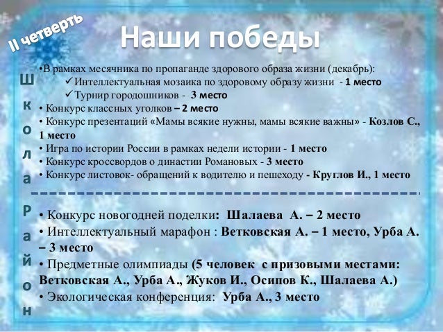 7. 7. •В рамках месячника по пропаганде здорового образа жизни (декабрь): Интеллектуальная мозаика по здоровому образу жизни - 1 место Турнир городошников - 3 место • Конкурс классных уголков – 2 место • Конкурс презентаций «Мамы всякие нужны, мамы всякие важны» - Козлов С., 1 место • Игра по истории России в рамках недели истории - 1 место • Конкурс кроссвордов о династии Романовых - 3 место • Конкурс листовок- обращений к водителю и пешеходу - Круглов И., 1 место • Конкурс новогодней поделки: Шалаева А. – 2 место • Интеллектуальный марафон : Ветковская А. – 1 место, Урба А. – 3 место • Предметные олимпиады (5 человек с призовыми местами: Ветковская А., Урба А., Жуков И., Осипов К., Шалаева А.) • Экологическая конференция: Урба А., 3 место Наши победы