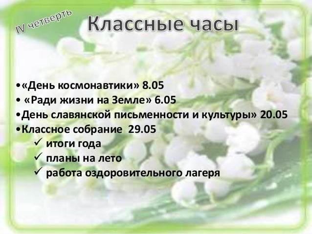 13. 13. •«День космонавтики» 8.05 • «Ради жизни на Земле» 6.05 •День славянской письменности и культуры» 20.05 •Классное собрание 29.05  итоги года  планы на лето  работа оздоровительного лагеря