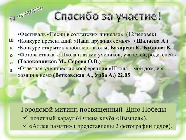 15. 15. •Фестиваль «Песни в солдатских шинелях» (12 человек) •Конкурс презентаций «Наша дружная семья» (Шалаева А.) •Конкурс открыток к юбилею школы, Бахарева К., Бубнова В. •Фотовыставка «Школа глазами учеников, учителей, родителей» (Толоконников М., Серова О.В.) •Отчетная ученическая конференция «Школа – мой дом, и я – хозяин в нем» (Ветковская А., Урба А.) 22.05 Городской митинг, посвященный Дню Победы  почетный караул (4 члена клуба «Вымпел»),  «Аллея памяти» ( представлены 2 фотографии дедов).