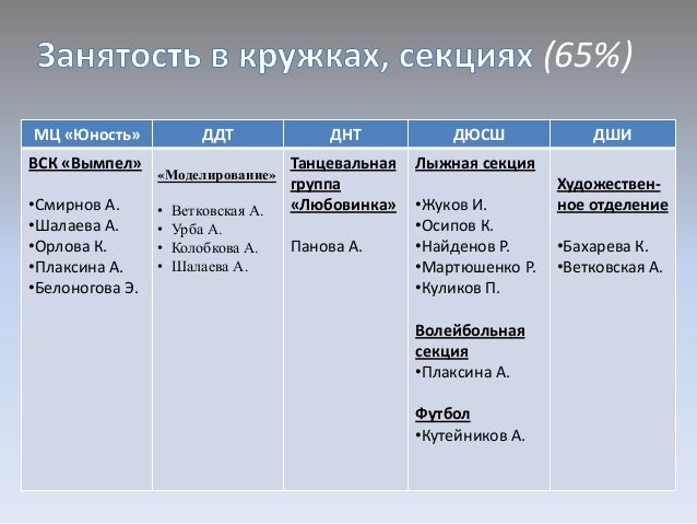 1. 1. (65%) МЦ «Юность» ДДТ ДНТ ДЮСШ ДШИ ВСК «Вымпел» •Смирнов А. •Шалаева А. •Орлова К. •Плаксина А. •Белоногова Э. «Моделирование» • Ветковская А. • Урба А. • Колобкова А. • Шалаева А. Танцевальная группа «Любовинка» Панова А. Лыжная секция •Жуков И. •Осипов К. •Найденов Р. •Мартюшенко Р. •Куликов П. Волейбольная секция •Плаксина А. Футбол •Кутейников А. Художествен- ное отделение •Бахарева К. •Ветковская А.