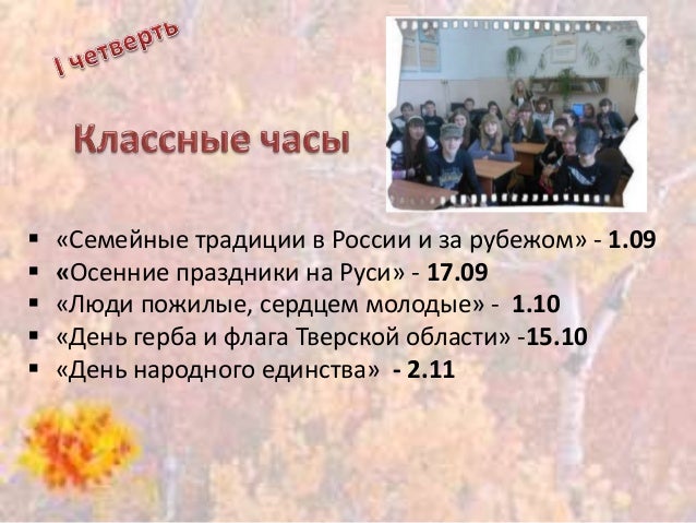 2. 2.  «Семейные традиции в России и за рубежом» - 1.09  «Осенние праздники на Руси» - 17.09  «Люди пожилые, сердцем молодые» - 1.10  «День герба и флага Тверской области» -15.10  «День народного единства» - 2.11