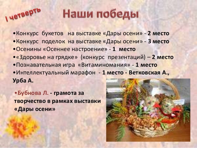 3. 3. •Конкурс букетов на выставке «Дары осени» - 2 место •Конкурс поделок на выставке «Дары осени» - 3 место •Осенины «Осеннее настроение» - 1 место •«Здоровье на грядке» (конкурс презентаций) – 2 место •Познавательная игра «Витаминомания» - 1 место •Интеллектуальный марафон - 1 место - Ветковская А., Урба А. •Бубнова Л. - грамота за творчество в рамках выставки «Дары осени»
