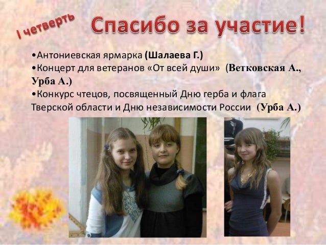 4. 4. •Антониевская ярмарка (Шалаева Г.) •Концерт для ветеранов «От всей души» (Ветковская А., Урба А.) •Конкурс чтецов, посвященный Дню герба и флага Тверской области и Дню независимости России (Урба А.)
