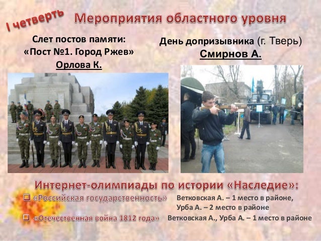 5. 5.  «Семейные традиции в России и за рубежом» - 1.09  «Осенние праздники на Руси» - 17.09  «Люди пожилые, сердцем молодые» - 1.10  «День герба и флага Тверской области» -15.10  «День народного единства» - 2.11 Слет постов памяти: «Пост №1. Город Ржев» Орлова К. День допризывника (г. Тверь) Смирнов А. Ветковская А. – 1 место в районе, Урба А. – 2 место в районе Ветковская А., Урба А. – 1 место в районе