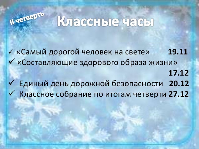 6. 6.  «Самый дорогой человек на свете» 19.11  «Составляющие здорового образа жизни» 17.12  Единый день дорожной безопасности 20.12  Классное собрание по итогам четверти 27.12