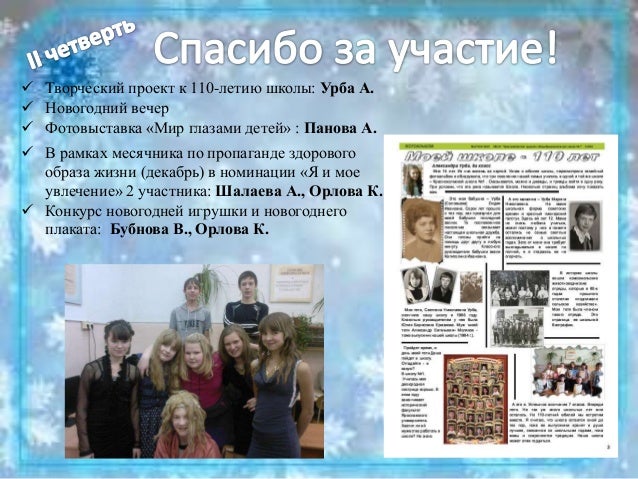 8. 8.  Творческий проект к 110-летию школы: Урба А.  Новогодний вечер  Фотовыставка «Мир глазами детей» : Панова А.  В рамках месячника по пропаганде здорового образа жизни (декабрь) в номинации «Я и мое увлечение» 2 участника: Шалаева А., Орлова К.  Конкурс новогодней игрушки и новогоднего плаката: Бубнова В., Орлова К.