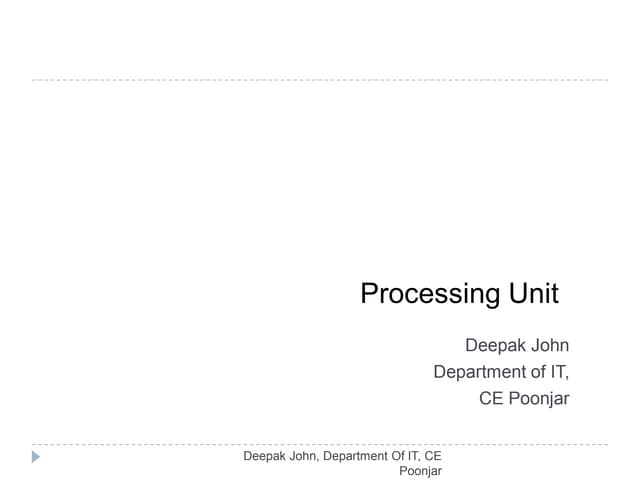 3. 3. 1. Arithmetic Logic Unit (ALU) An arithmetic­logic unit (ALU) is the part of a computer processor (CPU) that carries out  arithmetic  and logic operations  on the operands  in computer instruction  words. ALU  performs operations such as addition, subtraction and multiplication of integers and bit­ wise AND, OR, NOT, XOR and other Boolean operations. The CPU's instruction decode  logic determines which particular operation the ALU should perform, the source of the  operands and the destination of the result.  The width in bits of the words which the ALU handles is usually the same as that quoted  for the processor as a whole whereas its external buses may be narrower. Floating­point  operations are usually done by a separate "floating­point unit". Some processors use the  ALU   for   address   calculations   (e.g.   incrementing   the   program   counter),   others   have  separate logic for this.  In some processors, the ALU is divided into two units, an arithmetic unit (AU) and a  logic unit (LU). Some processors contain more than one AU ­ for example, one for fixed­ point  operations   and   another   for  floating­point  operations.   (In   personal   computers  floating point operations are sometimes done by a floating point unit on a separate chip  called a numeric coprocessor.)  Typically, the ALU has direct input and output access to the processor controller, main  memory  (random  access  memory  or RAM  in  a personal computer),  and input/output  devices. Inputs and outputs flow along an electronic path that is called a bus. The input  consists   of   an   instruction   word   (sometimes   called   a   machine   instruction   word)   that  contains an operation code (sometimes called an "op code"), one or more operands, and  sometimes a format code. The operation code tells the ALU what operation to perform  and the operands are used in the operation. (For example, two operands might be added  together or compared logically.) The format may be combined with the op code and tells,  for   example,   whether   this   is   a   fixed­point   or  a   floating­point   instruction.   The   output  consists of a result that is placed in a storage register and settings that indicate whether  3