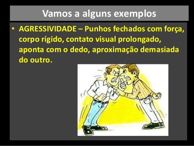 9. 9. Vamos a alguns exemplos • AGRESSIVIDADE – Punhos fechados com força, corpo rígido, contato visual prolongado, aponta com o dedo, aproximação demasiada do outro.