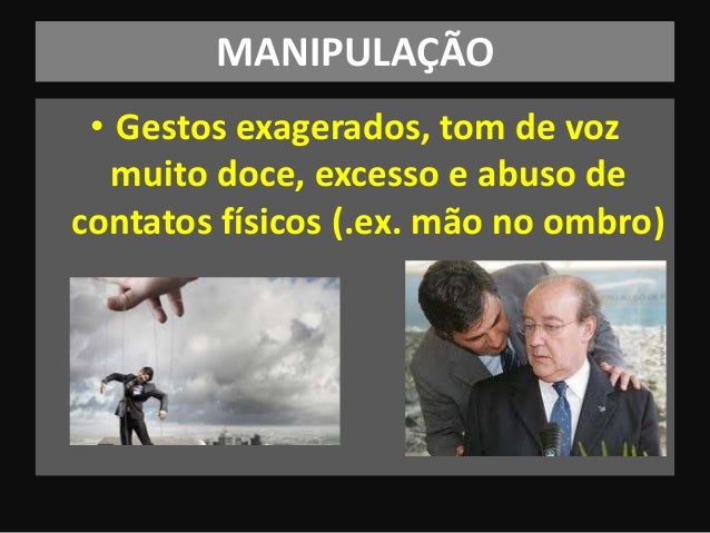 10. 10. MANIPULAÇÃO • Gestos exagerados, tom de voz muito doce, excesso e abuso de contatos físicos (.ex. mão no ombro)