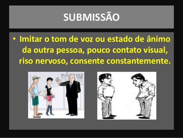 11. 11. SUBMISSÃO • Imitar o tom de voz ou estado de ânimo da outra pessoa, pouco contato visual, riso nervoso, consente constantemente.