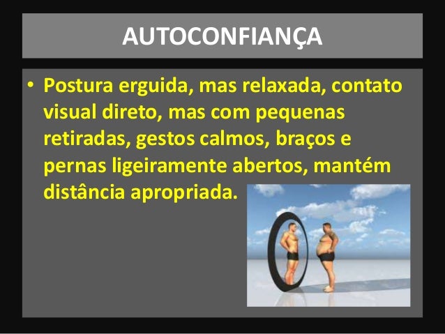 12. 12. AUTOCONFIANÇA • Postura erguida, mas relaxada, contato visual direto, mas com pequenas retiradas, gestos calmos, braços e pernas ligeiramente abertos, mantém distância apropriada.