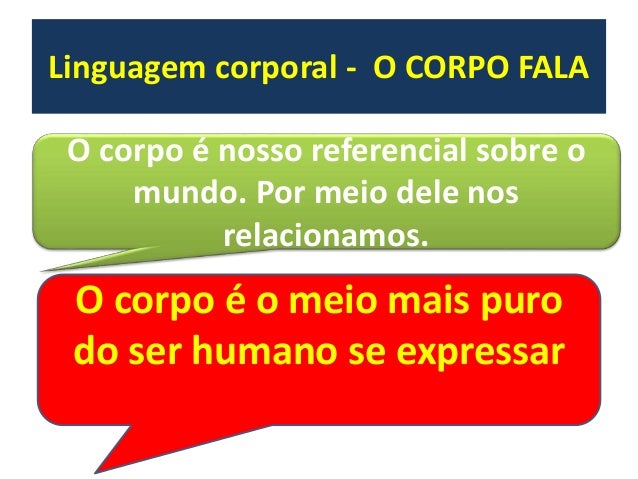 13. 13. Linguagem corporal - O CORPO FALA O corpo é nosso referencial sobre o mundo. Por meio dele nos relacionamos. O corpo é o meio mais puro do ser humano se expressar
