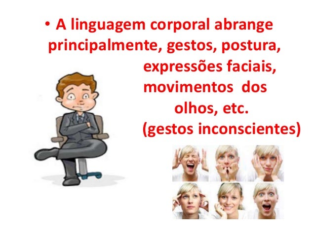 14. 14. • A linguagem corporal abrange principalmente, gestos, postura, expressões faciais, movimentos dos olhos, etc. (gestos inconscientes)