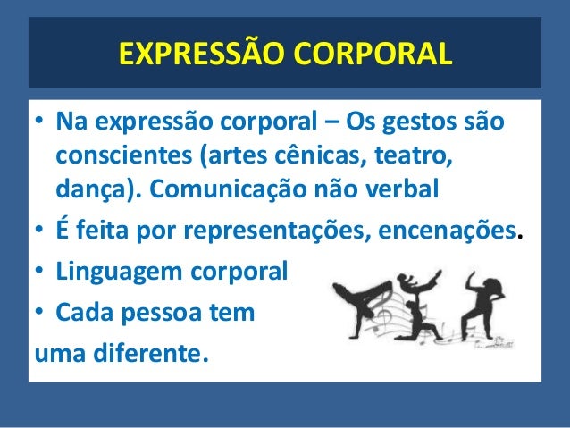 17. 17. EXPRESSÃO CORPORAL • Na expressão corporal – Os gestos são conscientes (artes cênicas, teatro, dança). Comunicação não verbal • É feita por representações, encenações. • Linguagem corporal • Cada pessoa tem uma diferente.