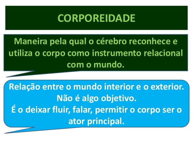 20. 20. CORPOREIDADE Maneira pela qual o cérebro reconhece e utiliza o corpo como instrumento relacional com o mundo. Relação entre o mundo interior e o exterior. Não é algo objetivo. É o deixar fluir, falar, permitir o corpo ser o ator principal.