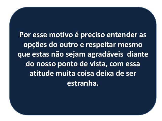 25. 25. Por esse motivo é preciso entender as opções do outro e respeitar mesmo que estas não sejam agradáveis diante do nosso ponto de vista, com essa atitude muita coisa deixa de ser estranha.