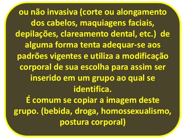 28. 28. ou não invasiva (corte ou alongamento dos cabelos, maquiagens faciais, depilações, clareamento dental, etc.) de alguma forma tenta adequar-se aos padrões vigentes e utiliza a modificação corporal de sua escolha para assim ser inserido em um grupo ao qual se identifica. É comum se copiar a imagem deste grupo. (bebida, droga, homossexualismo, postura corporal)